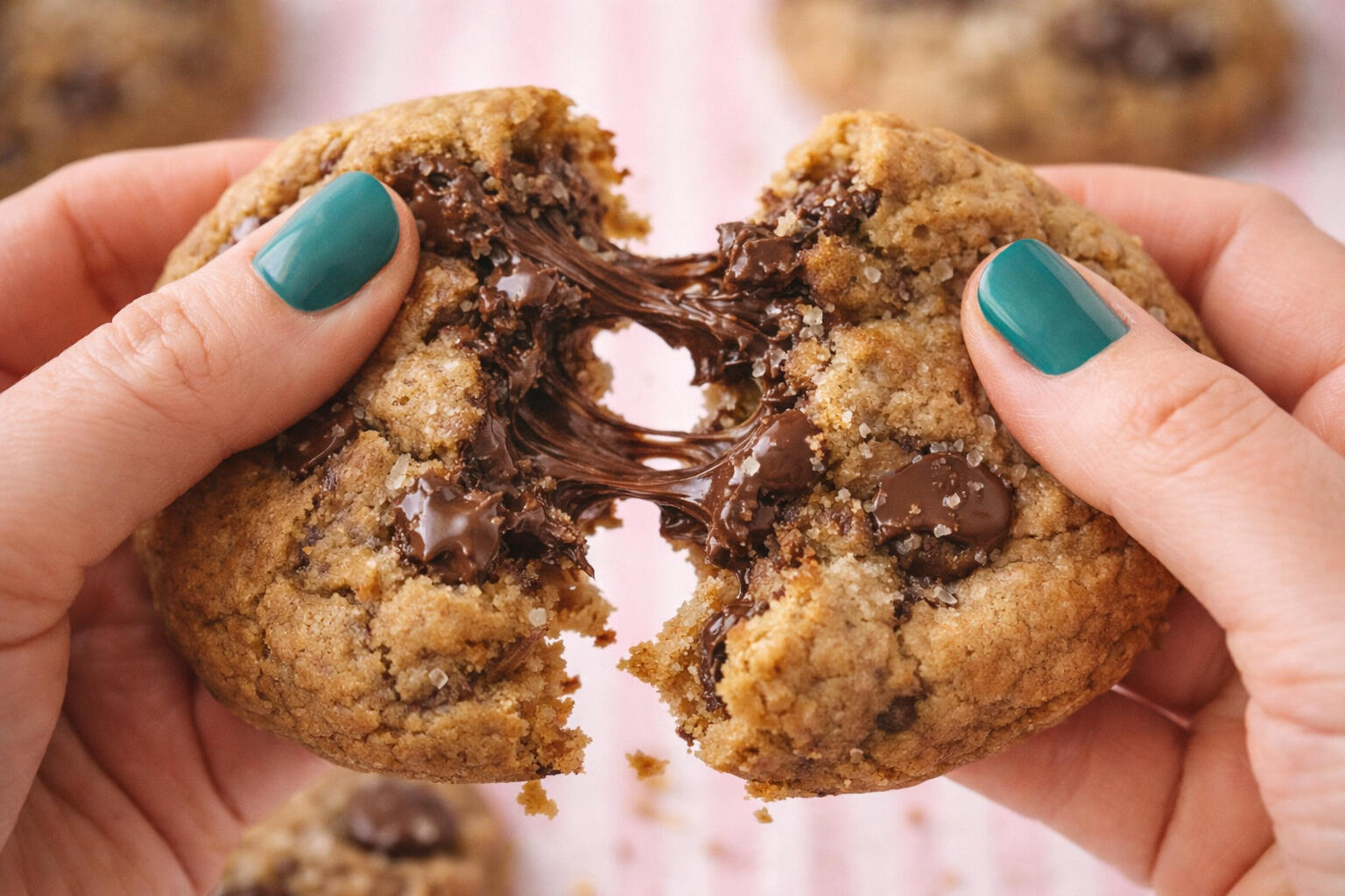 A buttery, ooey gooey, caramel rich cookie with super melty pools of chocolate and a soft, crumbly bite that stays chewy, never crunchy or cakey.